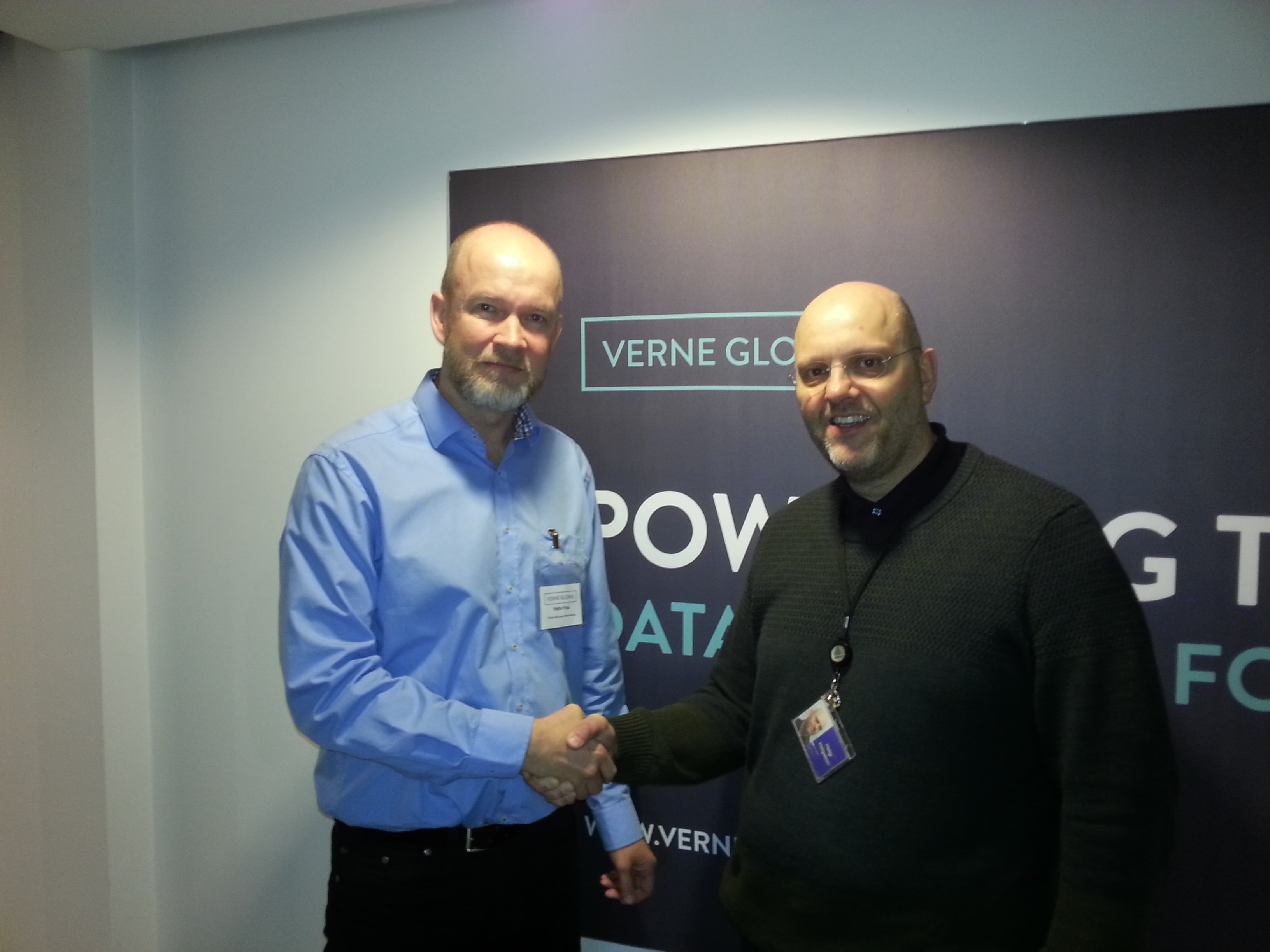 Á efri myndinni hér að neðan má sjá hægra megin Helga Helgason, Director of Operations hjá Verne Global, og vinstra megin Guðmund Jón Bjarnason, framkvæmdastjóra DMM Lausna, þegar gengið var frá samkomulagi fyrirtækjanna fyrr í dag.