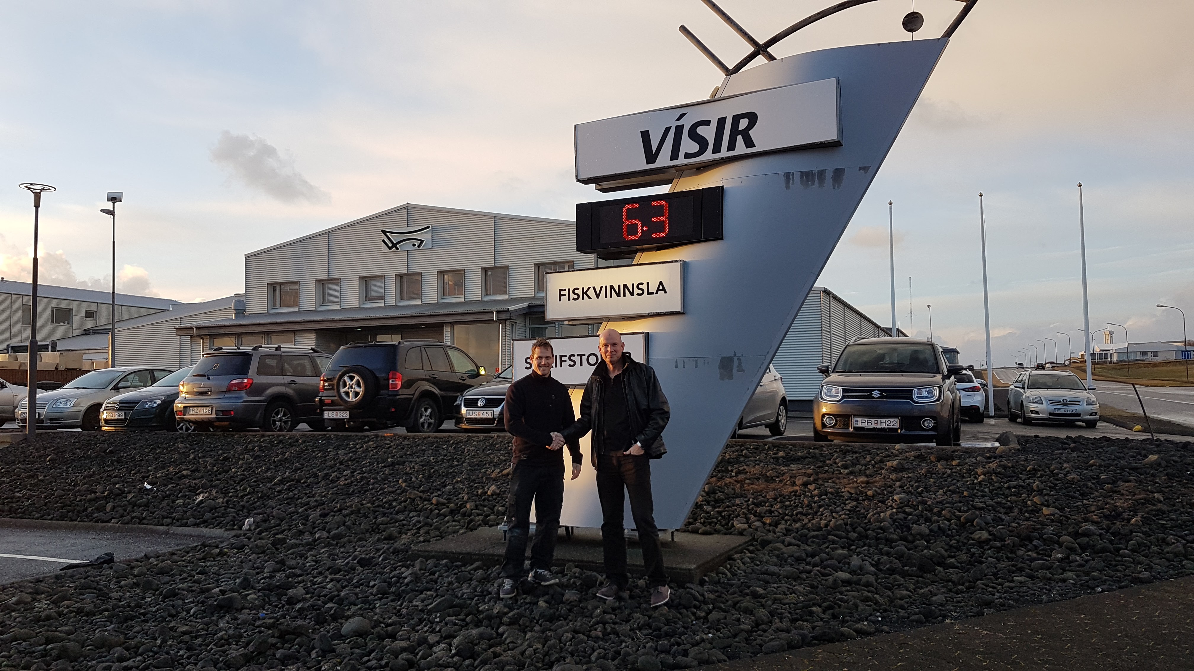 Fyrri myndin hér að neðan sýnir Eggert Pálsson hjá Vísi, vinstra megin, og Guðmund Jón Bjarnason DMM Lausnum við undirritum samnings og sú síðari sýnir þá félaga fyrir framan höfuðstöðvar Vísis í Grindavík.
